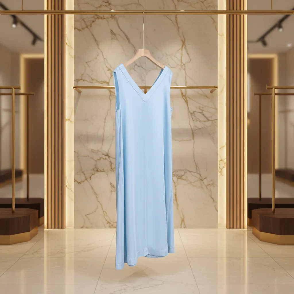 The double V-neck gently elongates the neck, adding a natural elegance—a quiet, effortless elegance that's more evident in the way you move than in the fabric itself.