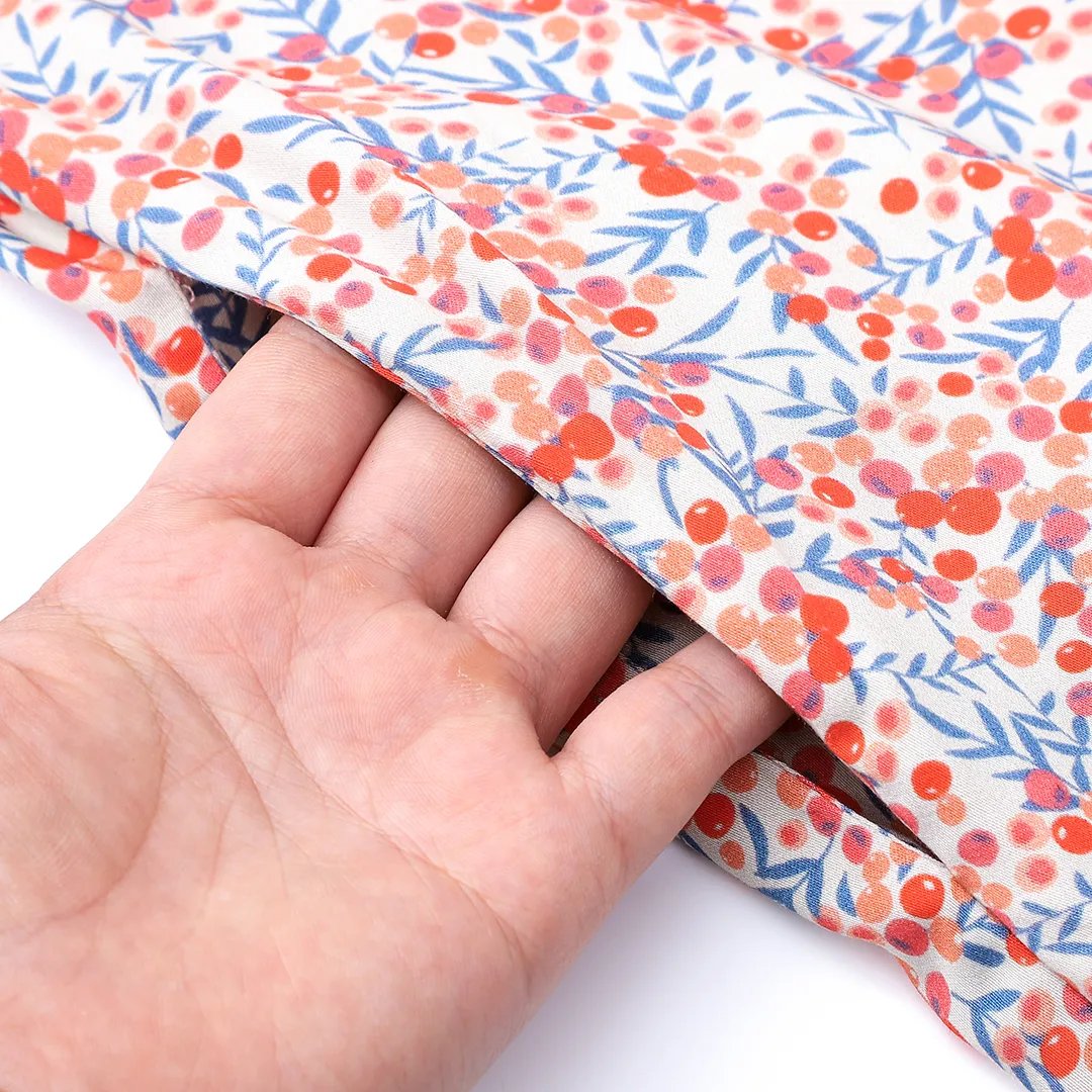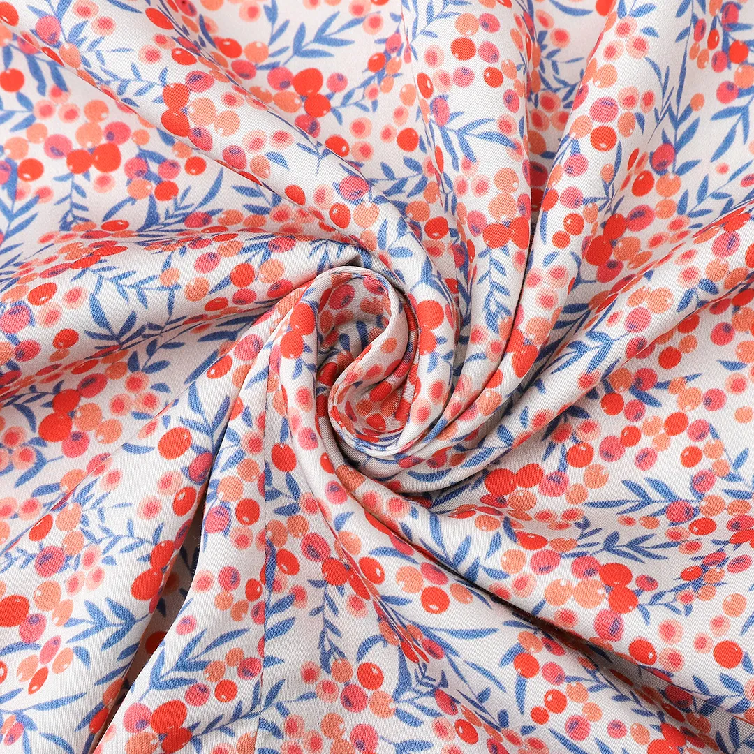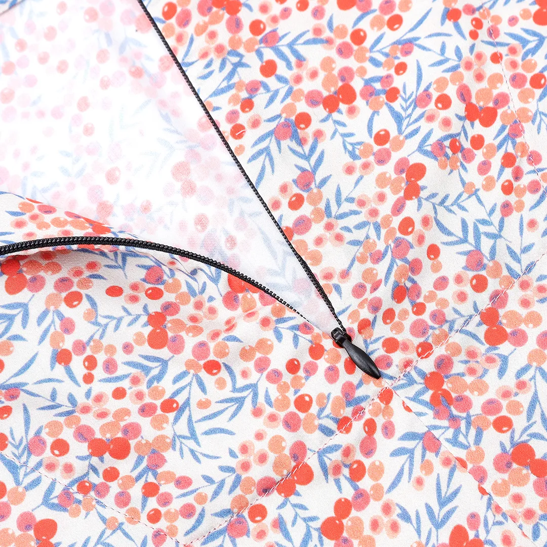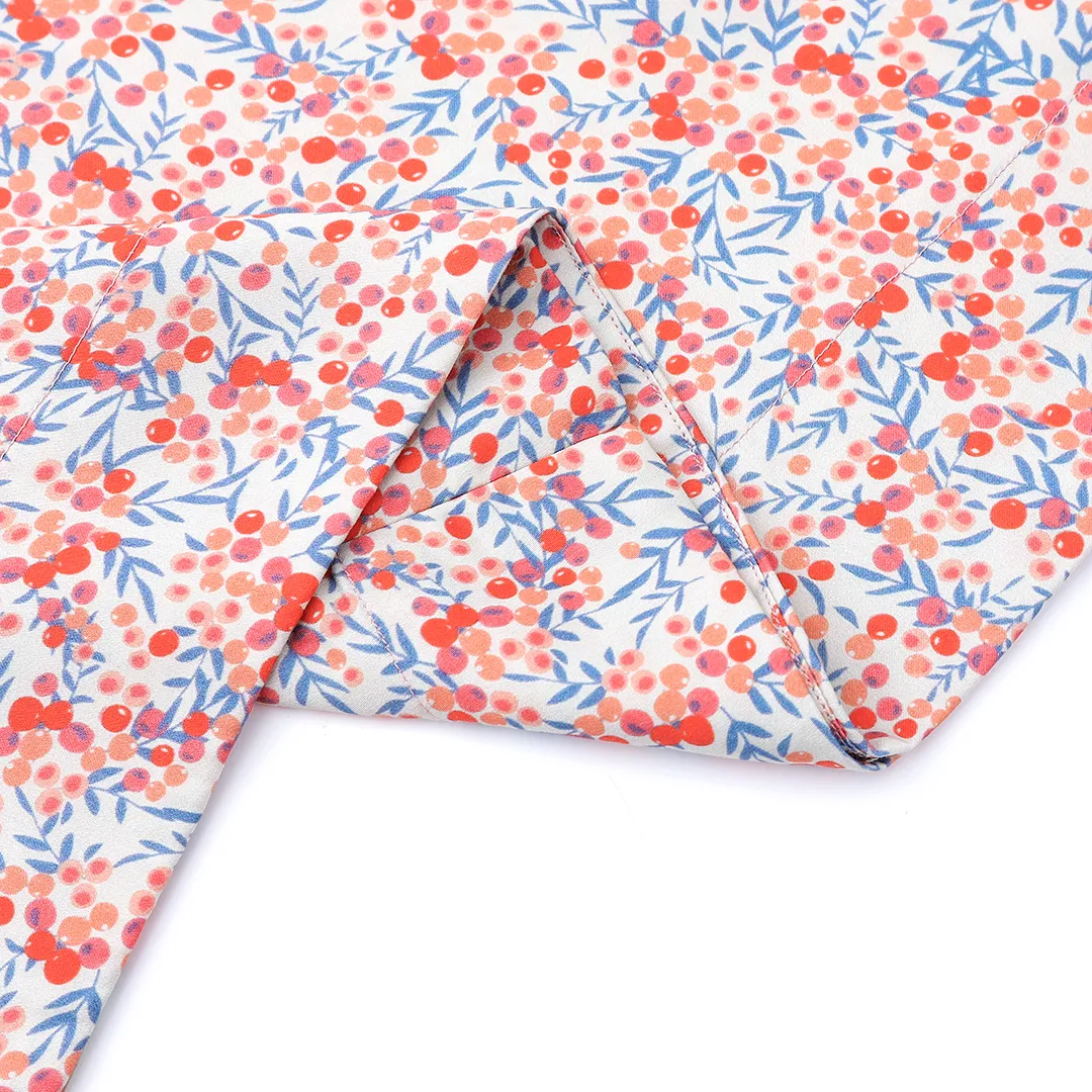 The pattern, full of small, berry accents, gives the dress a subtle, slightly vintage character.