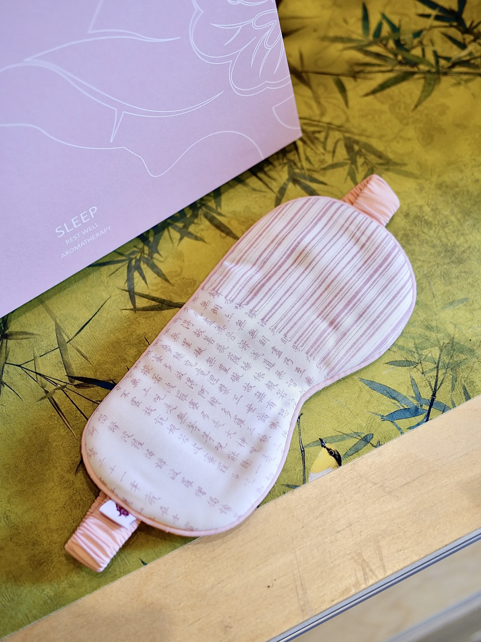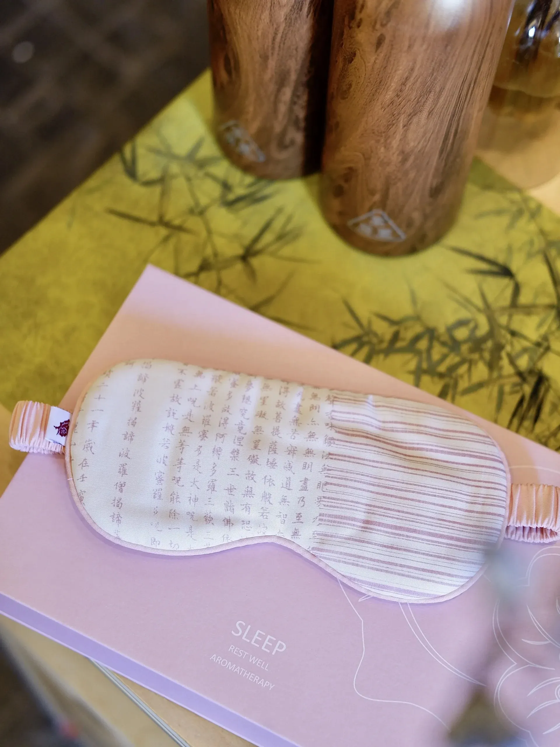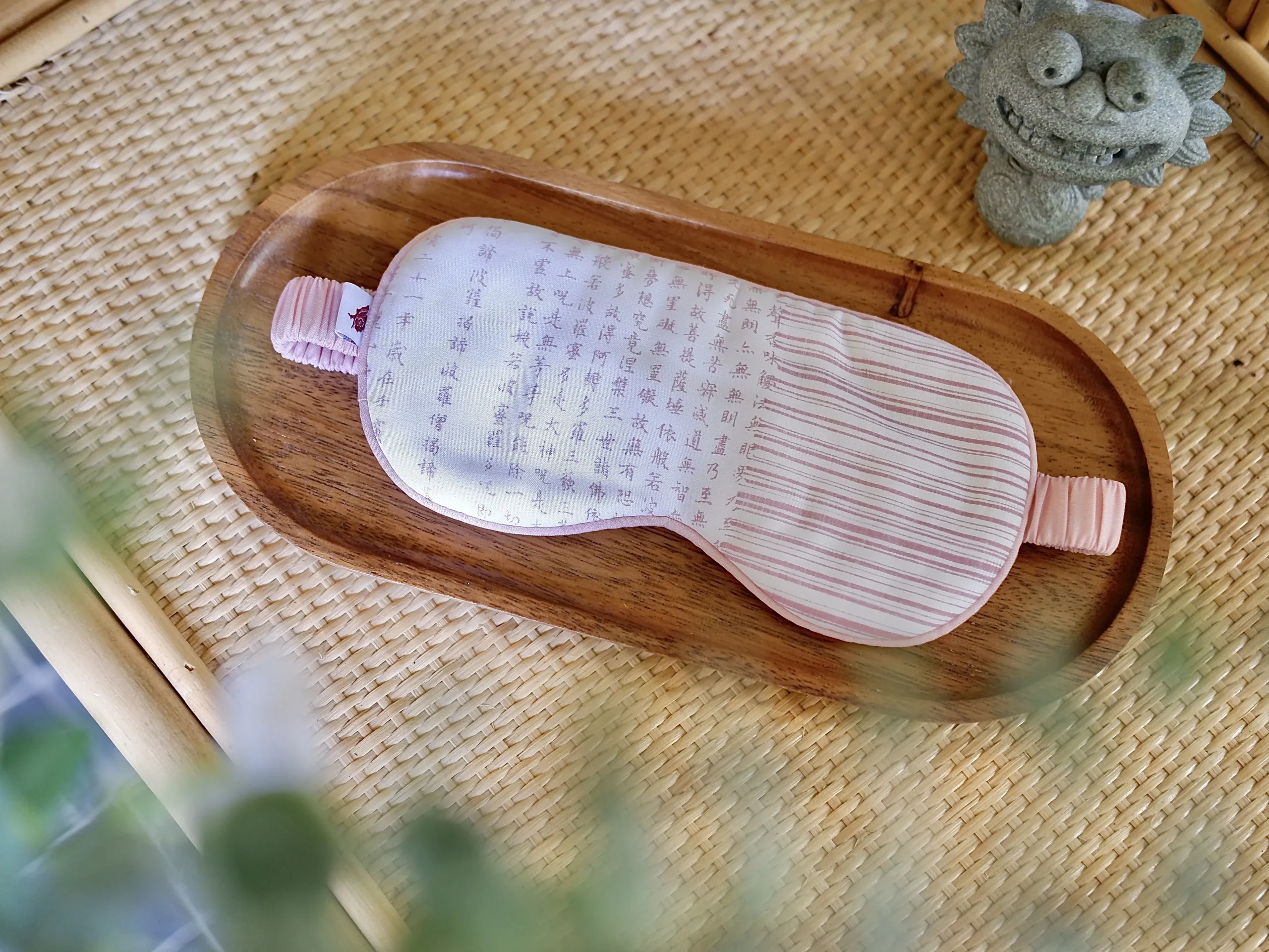 - Maskę na oczy z włókna bambusowego – oddychającą, miękką, z nadrukiem Sutry Serca – duchowego talizmanu spokoju i czystej świadomości.