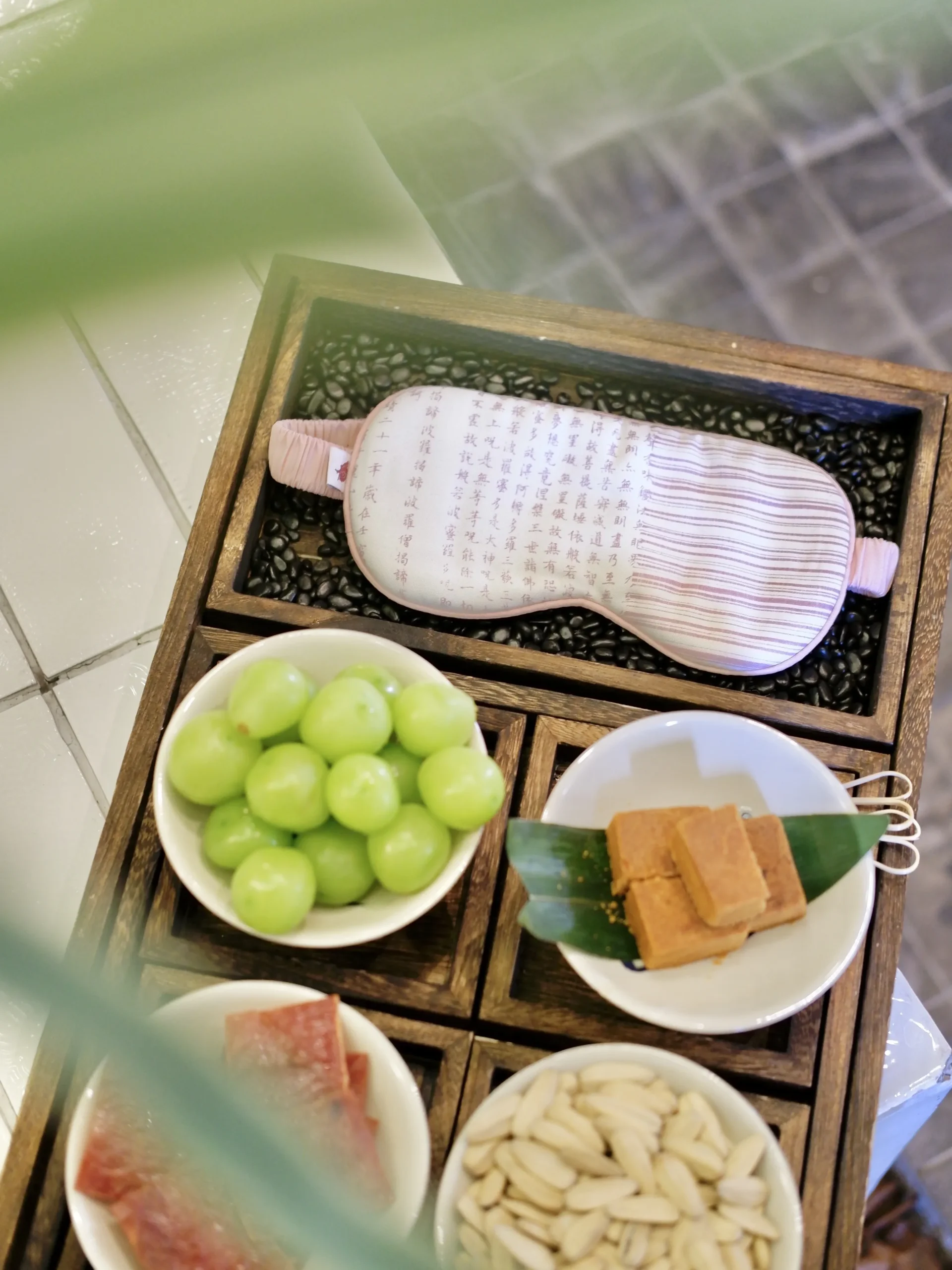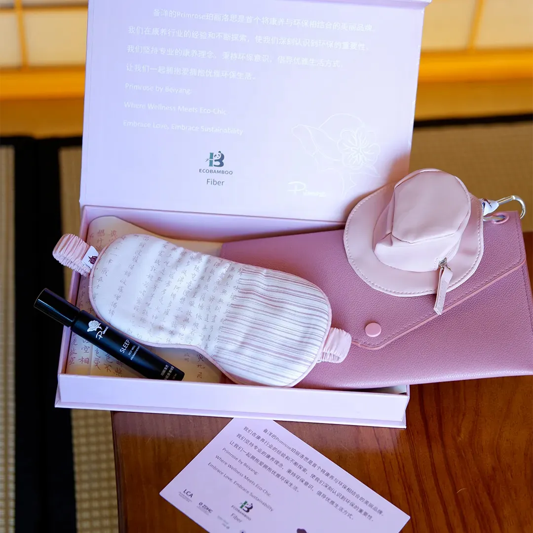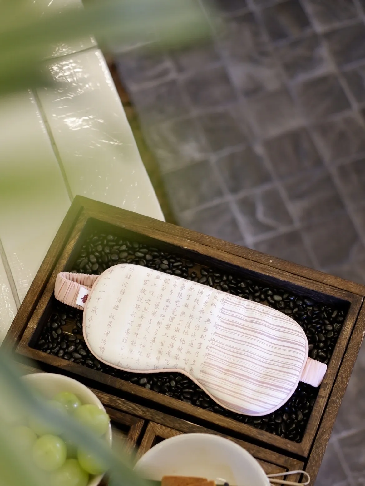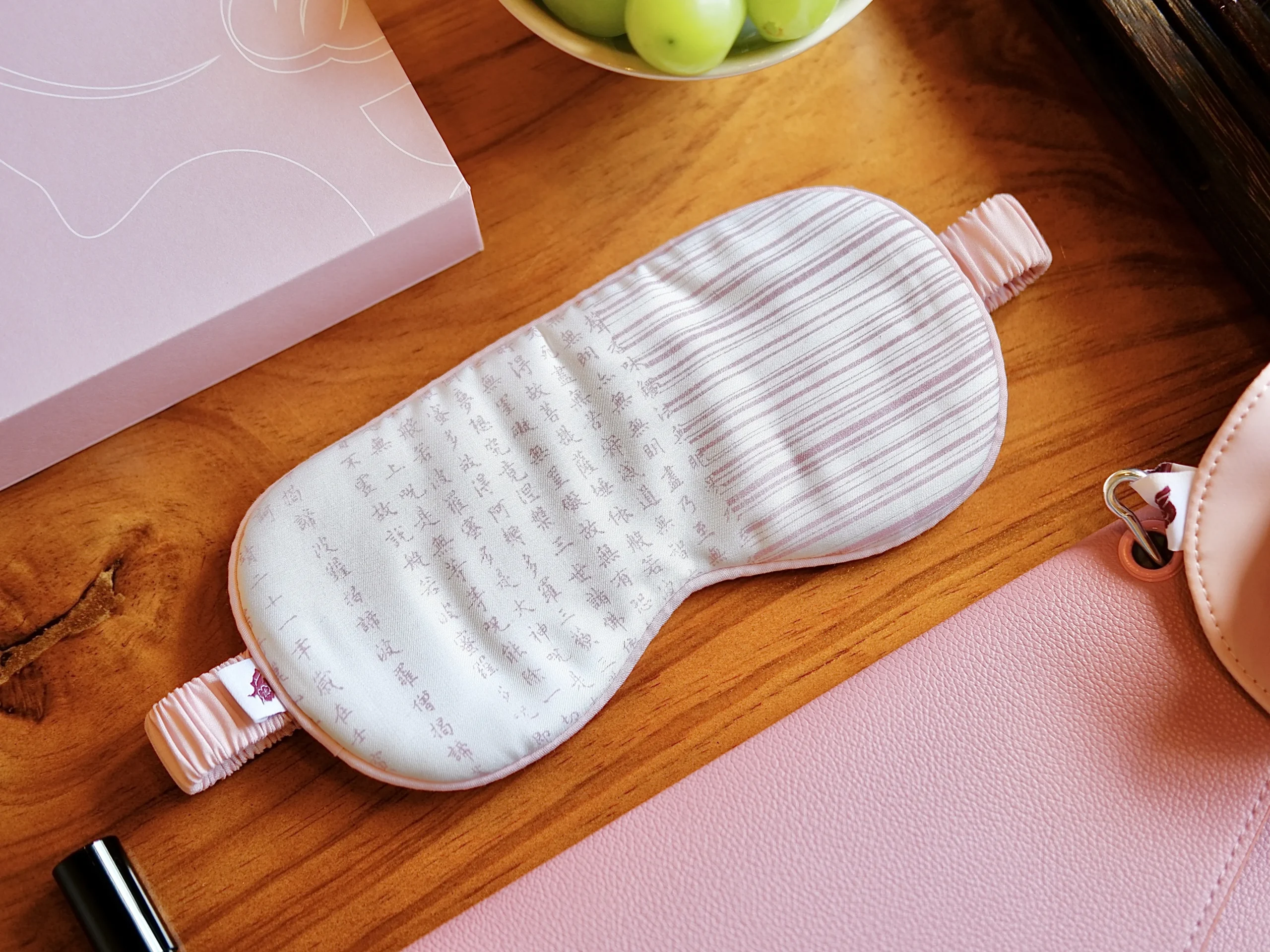 - Maskę na oczy z włókna bambusowego – oddychającą, miękką, z nadrukiem Sutry Serca – duchowego talizmanu spokoju i czystej świadomości.